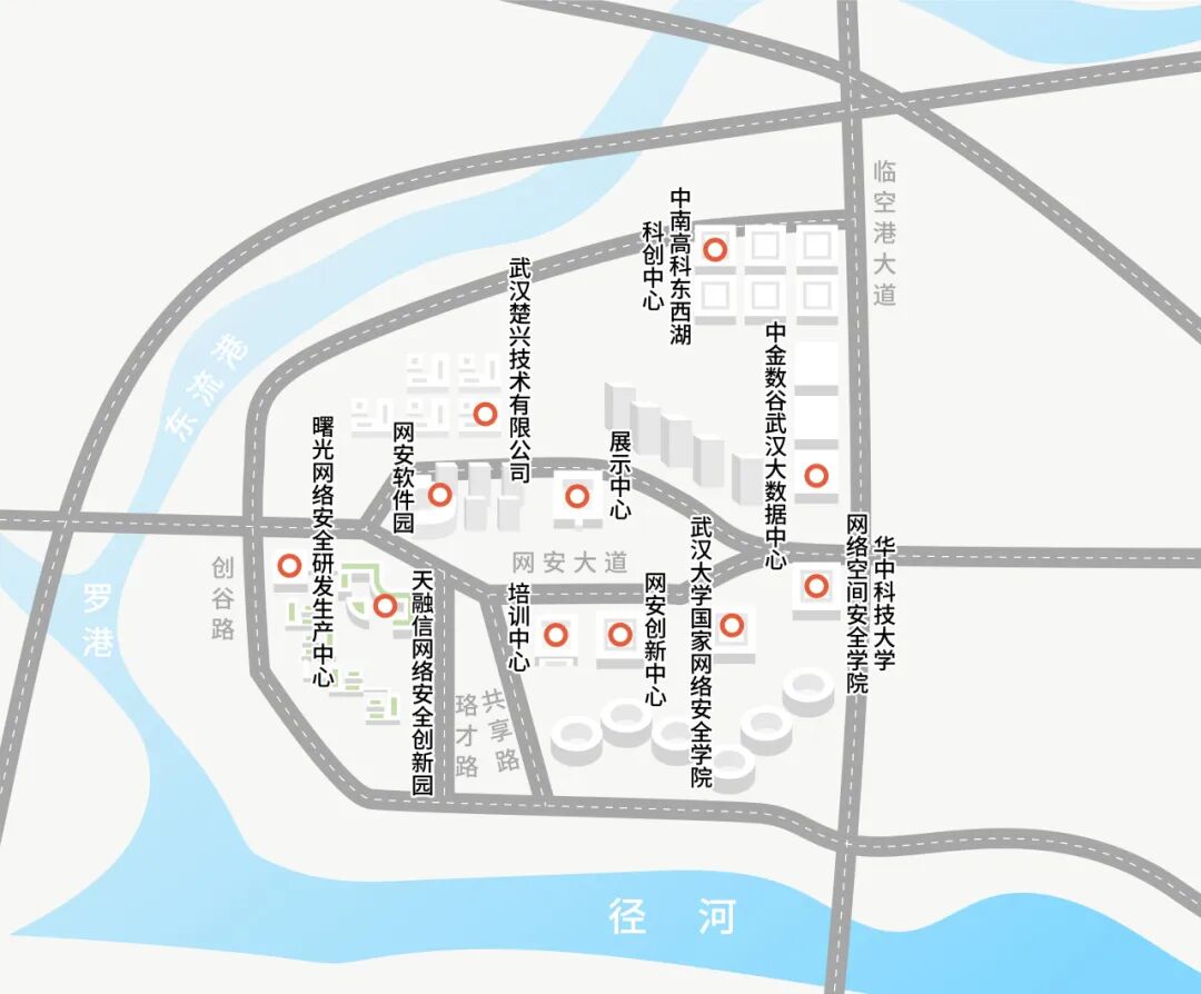 径河北岸,与临空港大道相接的1公里长网安大道,络才路、创智路、创想路等数十条道路密织成网,聚集了武汉楚兴技术有限公司、天融信网络安全创新园等220余家网安企业和园区。