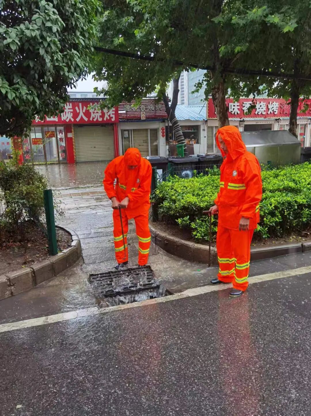 在现场,大家冒雨作业,清理下水口堆积的树叶杂物,对低洼路段及人流较大部位等重点区域进行抢排。