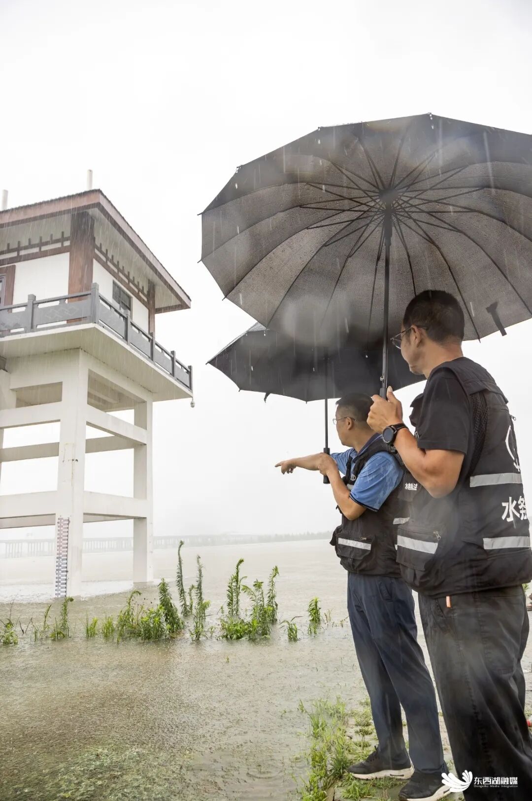 上午9点,大雨持续不停。在东西湖围堤29+000公里—55+000公里,东山河道堤防管理所的工作人员正在冒雨进行巡堤工作。记者看到,东山头闸水位观测点显示,水位25.35米。