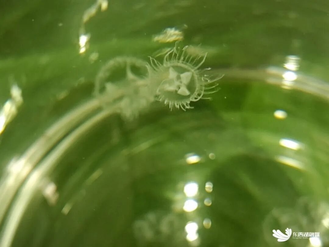 7月14日,技术员彭贤在中心湖泊4米深水区潜水查看沉水植物生长情况时发现,金鱼藻和苦草之间有伞状浮游生物闪现。这种伞状生物通身透明,似乎在科幻大片里出现过。