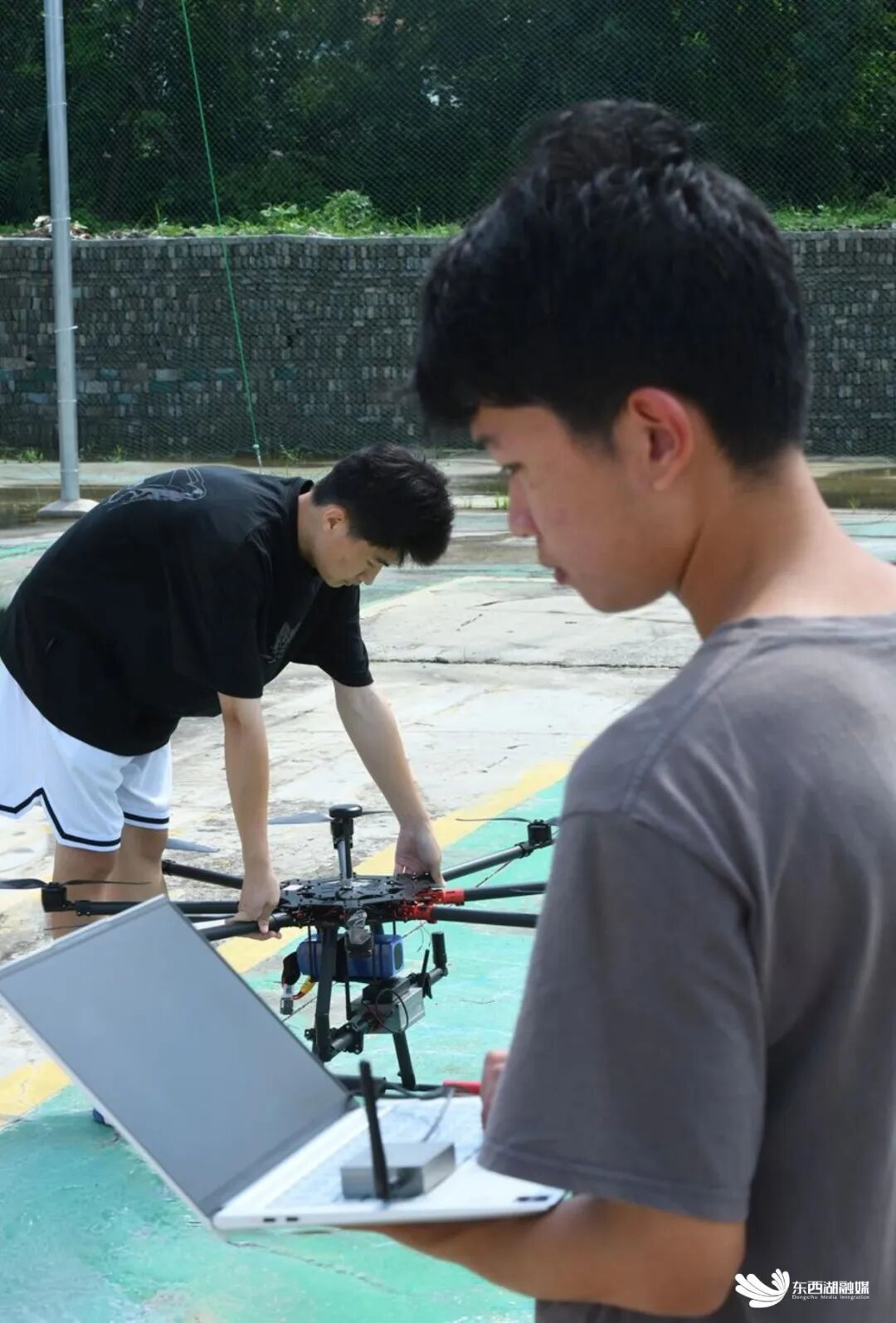无人机试飞前的调试工作。