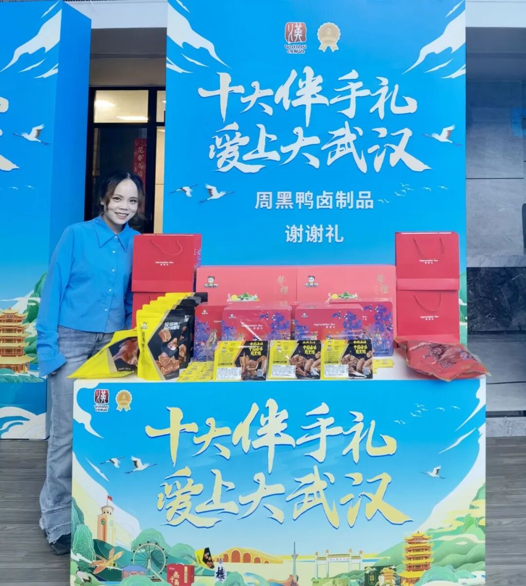 前不久,2024年下半年武汉十大伴手礼宣传推广暨“大学生推荐官”活动在武汉文化金融服务中心启动,来自东西湖的湖北周黑鸭食品工业园有限公司携“谢谢礼”礼盒和其他特色产品亮相活动现场。