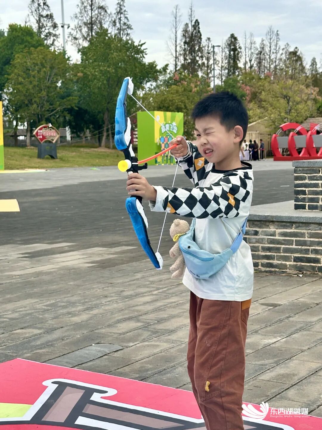 每天下午,投壶比赛、儿童射箭、套圈比赛、沙包擂台、飞盘得分等趣味游戏,让孩子们在玩乐中释放天性。参与游戏的亲子家庭,在活动里集得印章,兑换零食和玩具公仔。