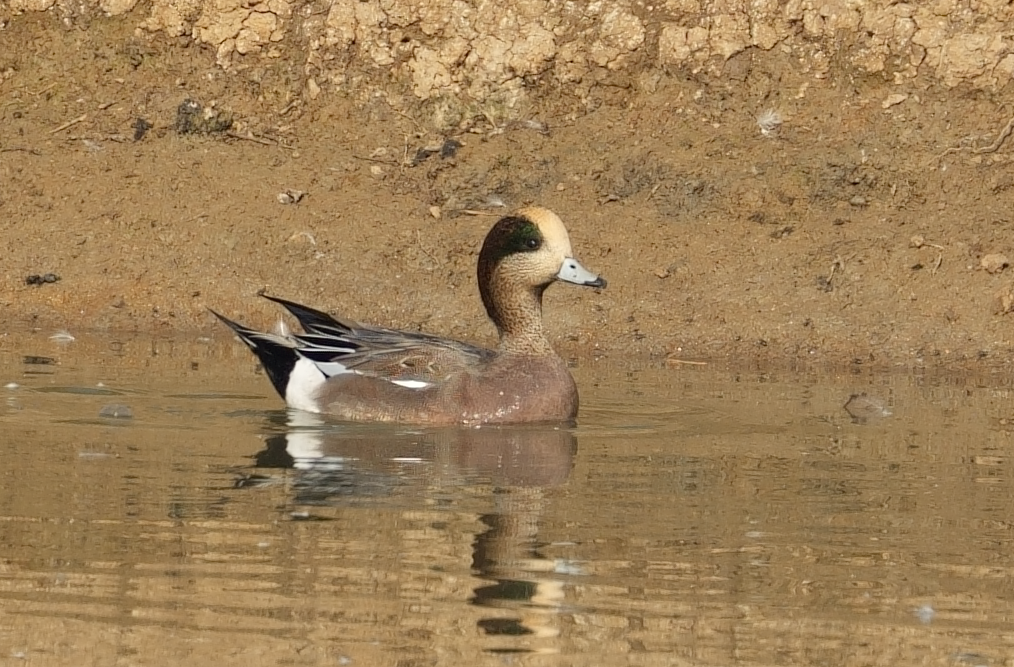观测到的绿眉鸭为雄鸟,头顶皮黄,脸有灰色杂斑,从眼周到枕部有带绿色光泽的黑宽带,胸、两胁、背褐色偏粉,翼下中覆羽白。与赤颈鸭相比,绿眉鸭体型较大,头圆,眼周到枕部无红褐色,肩背无灰色,腋羽偏白。