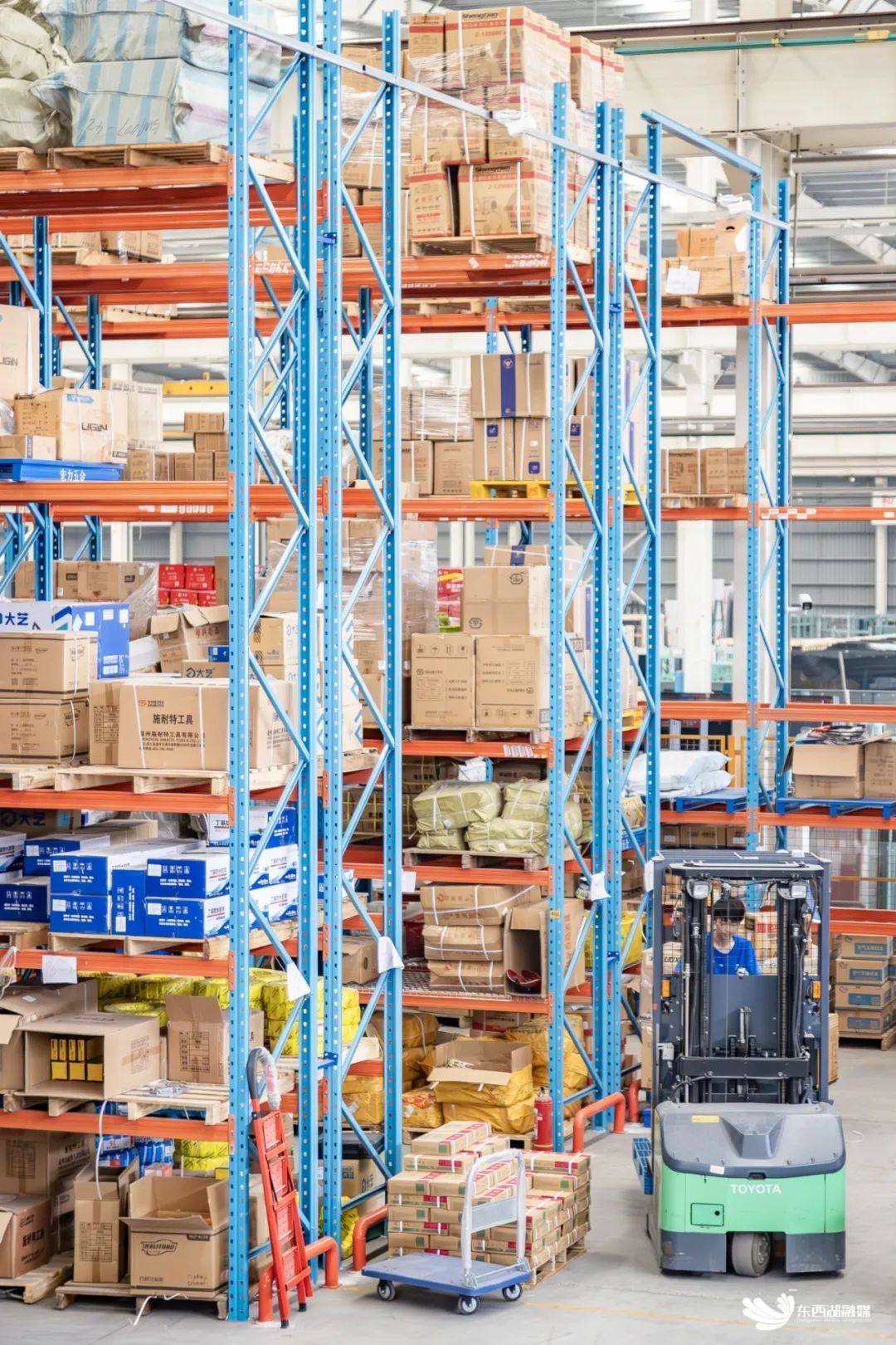 800米长的立体式智能货架,分六层叠放的成箱货物,120万种五金机电产品琳琅满目……