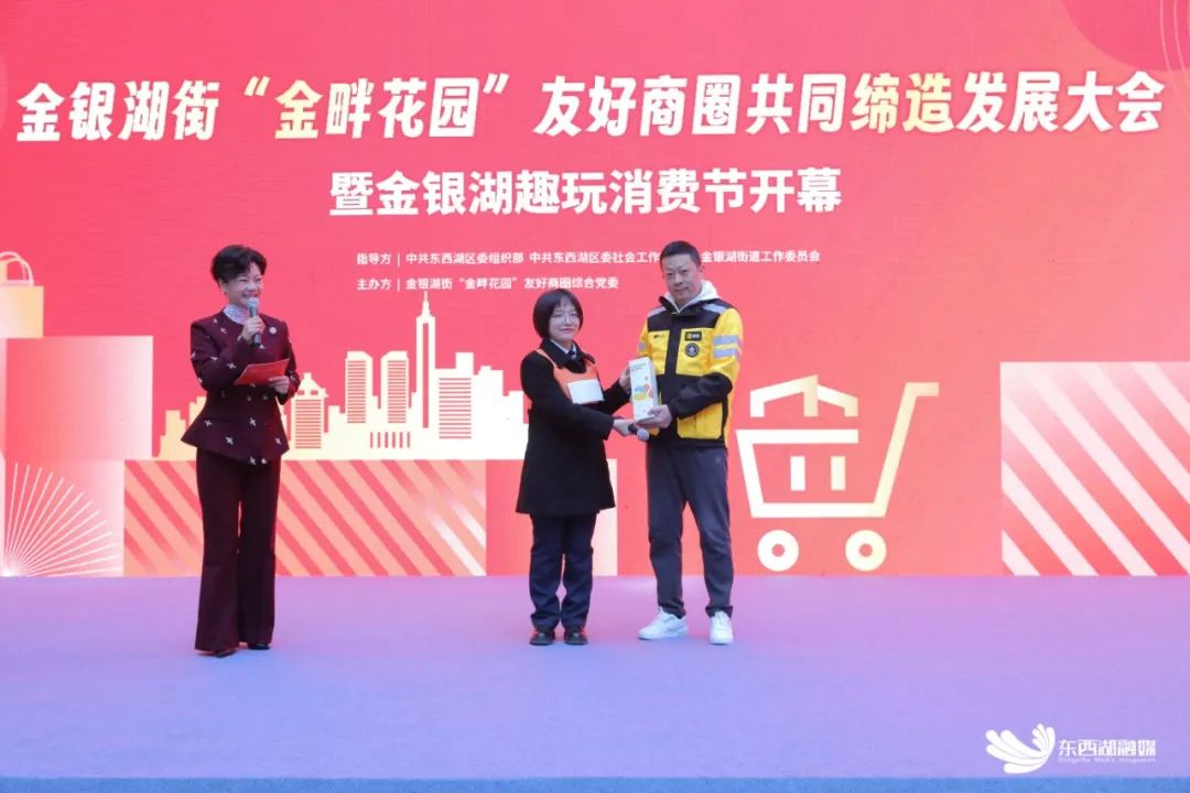 商户为居民发福利,居民为商户送人气,双向互惠,刺激商圈经济消费,激发商圈活力引擎。东西湖区博雅图培训学校等5家获评“金畔花园”友好商圈年度优秀会员商户,还当场为外卖小哥送上专属暖“新”好礼。
