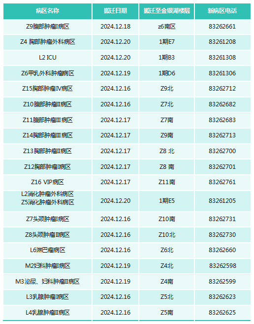 协和医院肿瘤中心将于2024年12月16日至12月20日搬迁至金银湖院区,并全面开展诊疗服务。