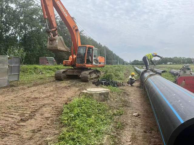 荷纱路供水管道沿线均为基本农田、居民区、高压走廊,并穿插沪蓉高速等复杂路段,铺设困难重重。其中,有一段管线需穿过新沟镇批发市场,市场营业时间为每天凌晨5点至下午,与施工时间冲突。为降低周边影响,提升施工效率,施工团队在下午5点到次日5点开展错峰作业。