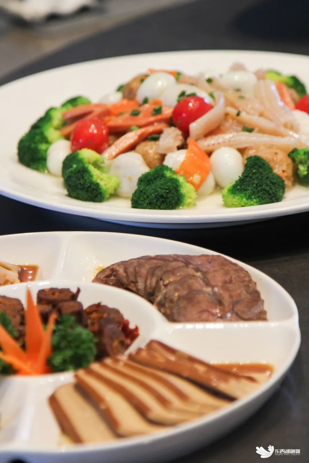 金银湖半岛庄园隐柿别院餐厅主打一个“新鲜”,餐厅前一大片菜地和水塘让游客仿佛穿越到了某个乡村,地里各种蔬菜茁壮成长,一片绿油油。现摘的蔬菜嫩得都能掐出水来,摘下来直送厨房,炒得香喷喷,吃的就是那个原汁原味。