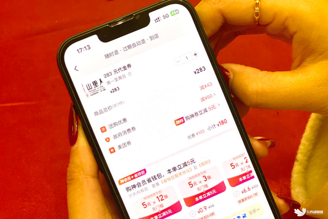 “在前台买单时,服务员告诉我美团套餐还可以叠加政府消费券使用,我立马根据餐厅门口的指引牌抢券,享受了‘折上折’。”顾客小刘没想到在为“团年饭”结账时还能收获意外惊喜。