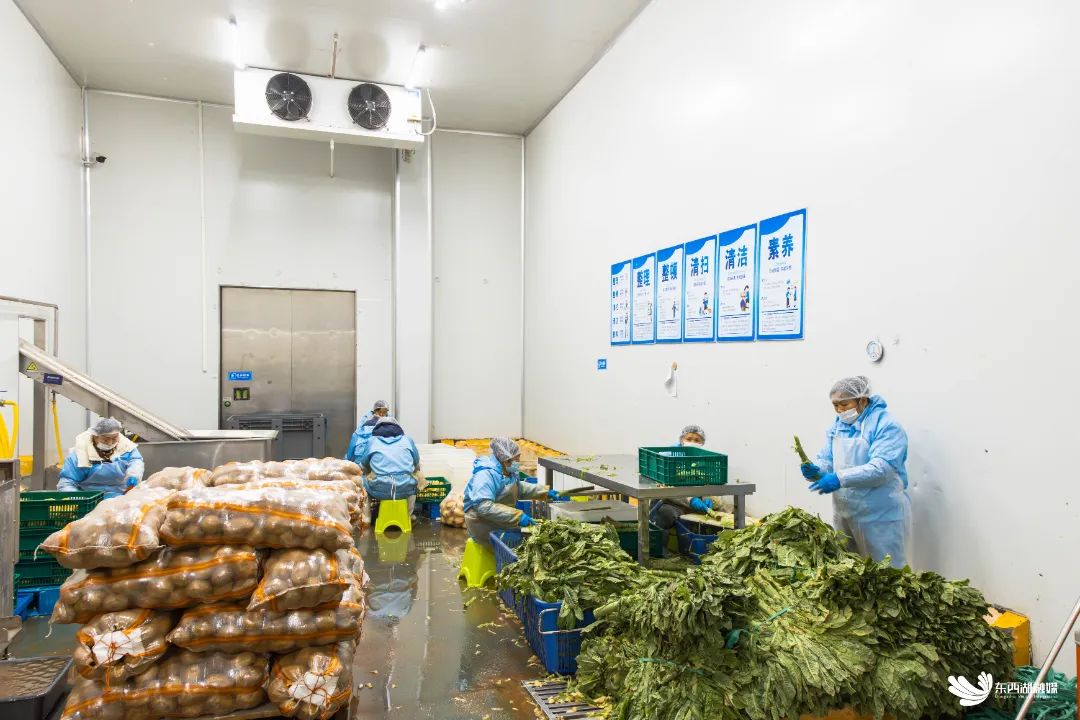 在毛菜车间里,大白菜、小白菜、茄子、白萝卜等蔬菜正在进行分拣,去掉破损叶面,清理掉泥土,工作人员将品质最好的蔬菜进行打包、称重,随后将其装车发往商超、食堂等客户群体。