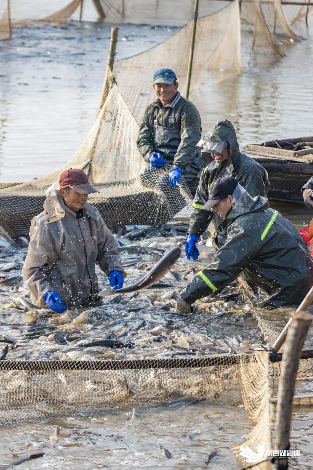 “起网了!”1月16日上午8点,在国家万亩渔业绿色循环试点基地,鳊鱼、青鱼、草鱼、鲢鱼、鳙鱼等水产被“一网打尽”,记者看到个头最大的鲜鱼要数又称为胖头鱼的鳙鱼,一条约有20斤,十分肥美。