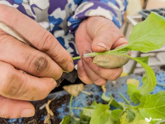 苗床旁,育苗人员手上生花,正在对辣椒、茄子等作物种苗进行嫁接。