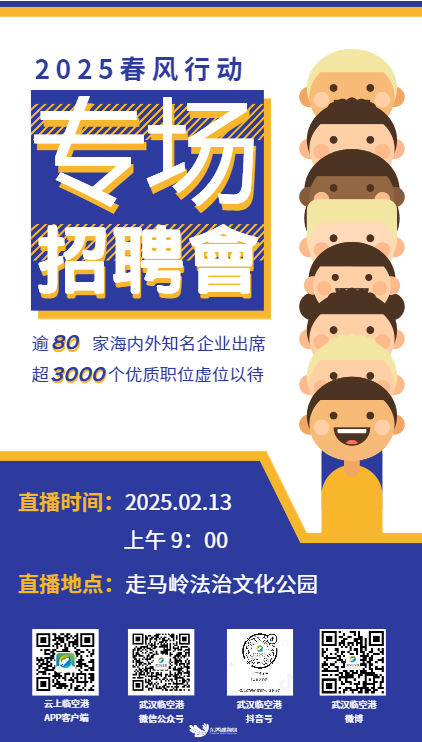 2025年2月13日(周四)上午9:00-12:00,2025年武汉临空港经济技术开发区(东西湖区)春风行动专场招聘会,在走马岭街法治文化公园举行。
