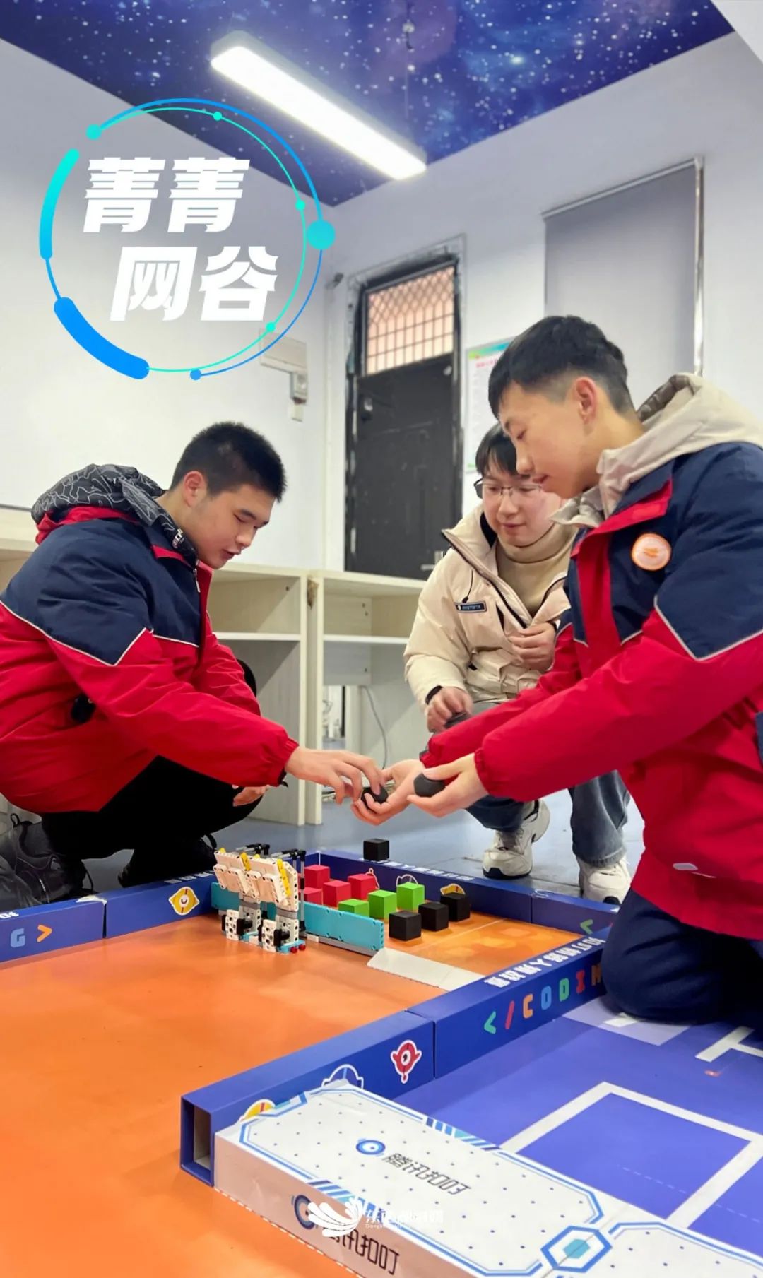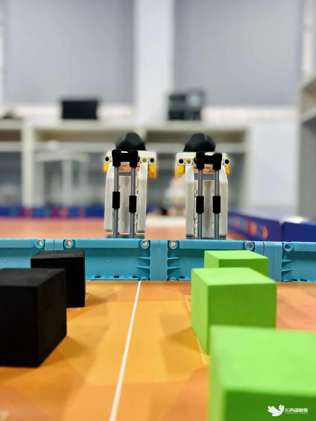 正式比赛中,龙宇轩负责编程,汤睿杰负责遥控操作,两人凭借扎实的技术和默契的配合,操控机器人在3分钟内完成了放置能量块、夹取各色方块、建立通讯及小车回家等全部任务。