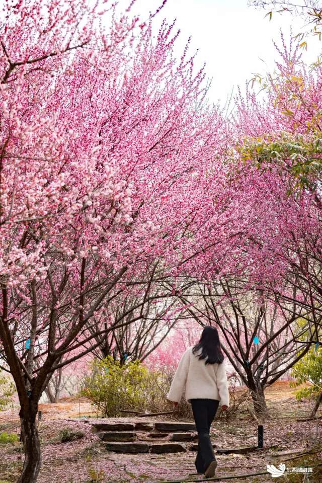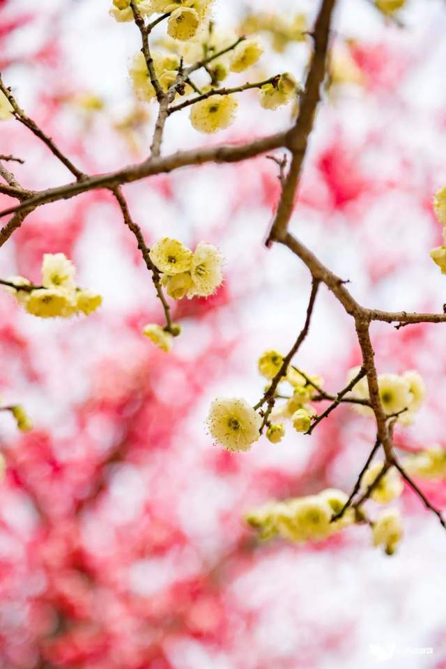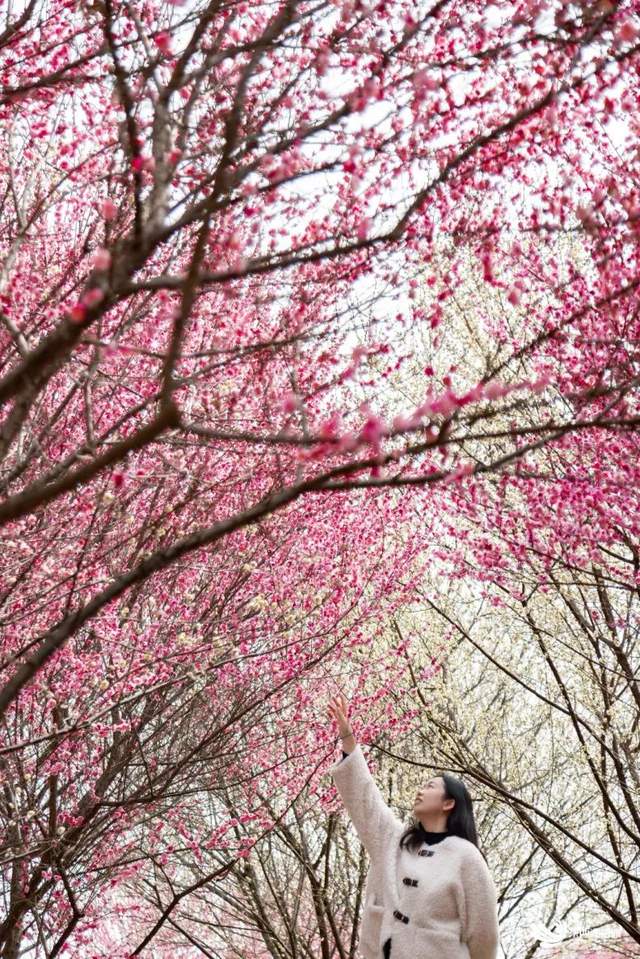 往来游客皆手持相机、手机,定格这份美好,已然成为远近闻名的拍照打卡圣地。白梅似雪,纯净素雅;红梅若霞,娇艳夺目;粉梅像少女的笑靥,甜美动人,共同交织成一幅绚丽多彩、层次分明的天然画卷。