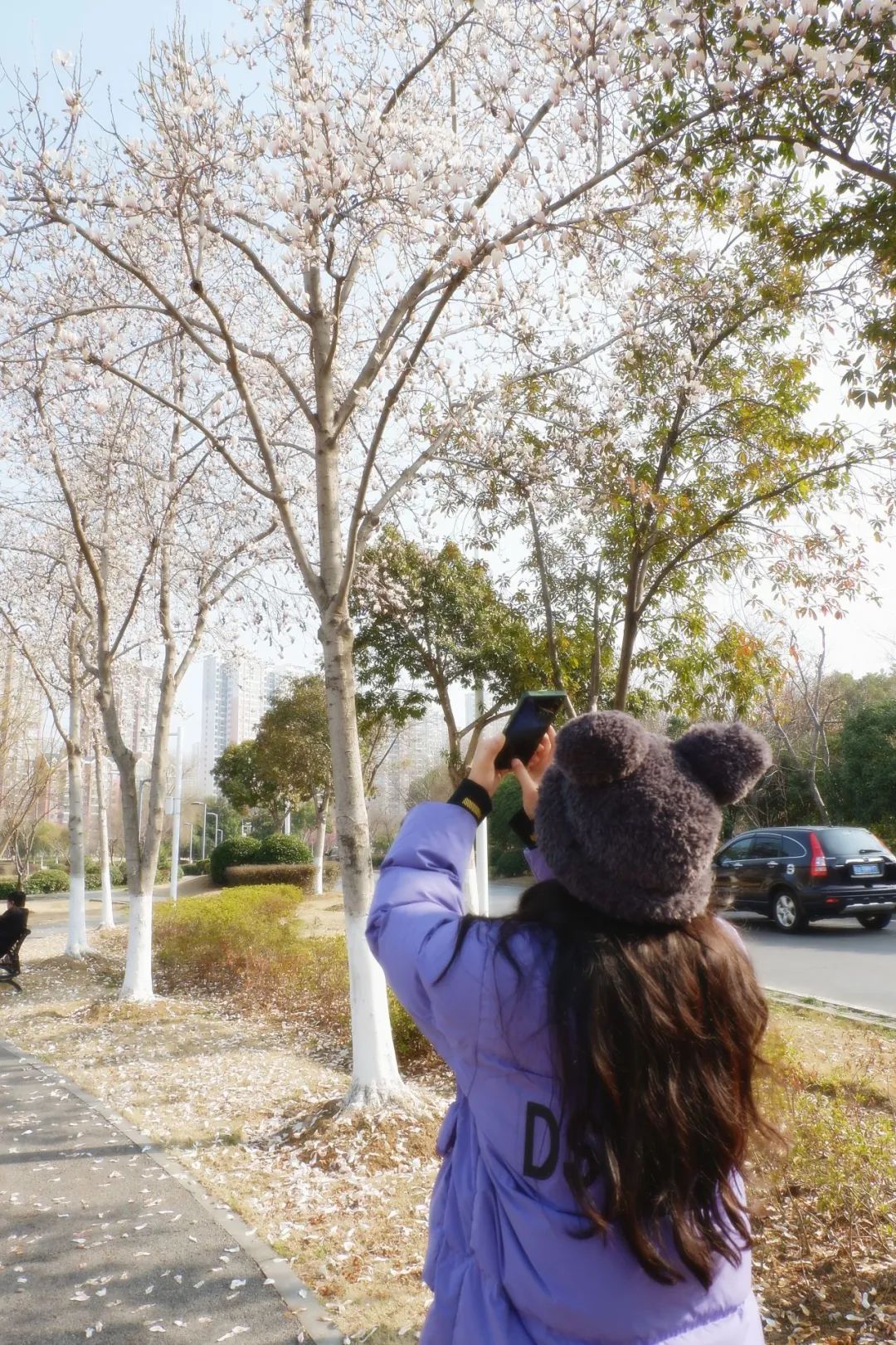 「吴家山公园」的玉兰花主要集中在吴家山公园环山路,公园以白玉兰为主,搭配紫玉兰,形成“雪映紫霞”景观。
