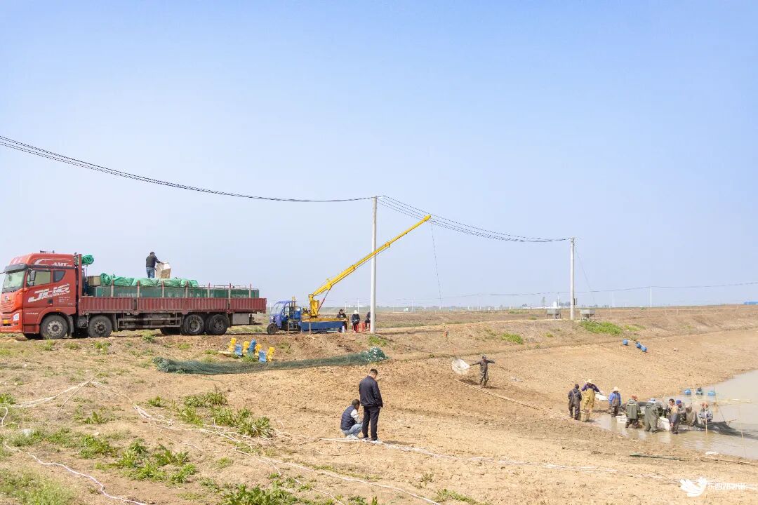 国家万亩渔业绿色循环试点基地鲜鱼起网现场。