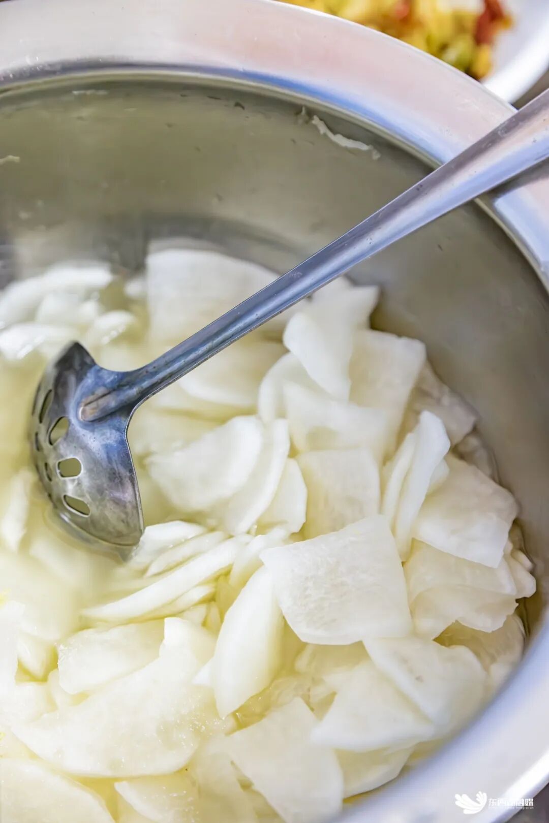 “附近上班的小伙子们爱吃酸辣口,我就多切两盘萝卜。” 老板娘边说边往盆里补菜。