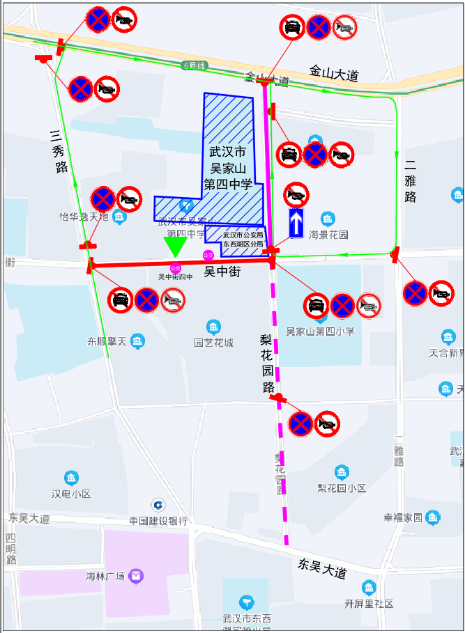 7时至19时,吴中路、三秀路(金山大道至吴中路)、二雅路(金山大道至吴中路)、梨花园路(金山大道至吴中路)、金山大道(二雅路至三秀路)禁止机动车停放(除停车泊位外)、禁止鸣笛。