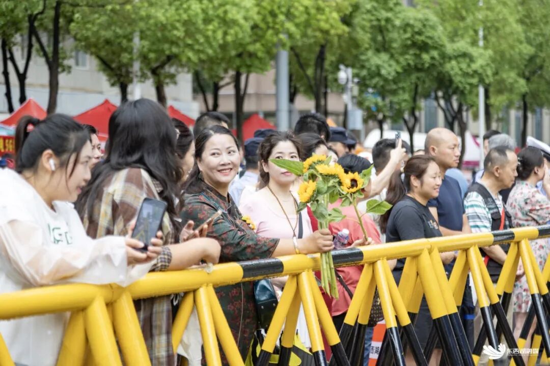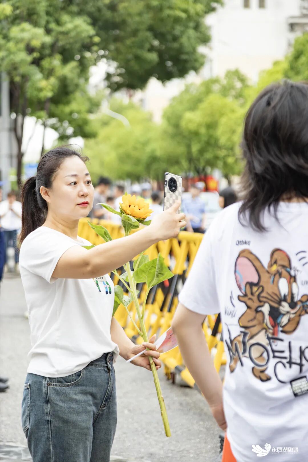 弟弟妹妹前来送考,众人手中高举的向日葵鲜艳夺目,洋溢着喜悦与期待。