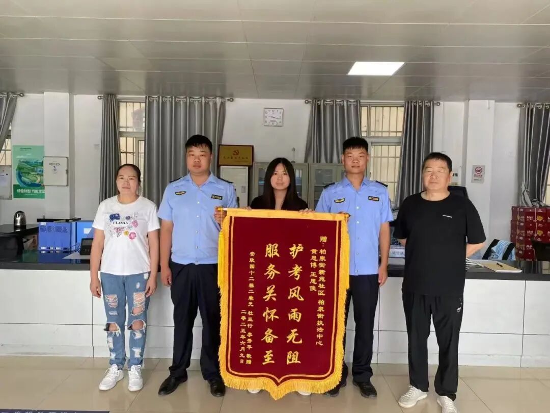 “高考三天里,执法队员就像家人一样守护着我。”回忆起这段特殊时光,杜伟仍充满感激。6月12日,杜伟和家人特意制作了一面写着“护考风雨无阻 服务关怀备至”的锦旗,送到柏泉街综合执法中心队员王思俊和黄思博手中。
