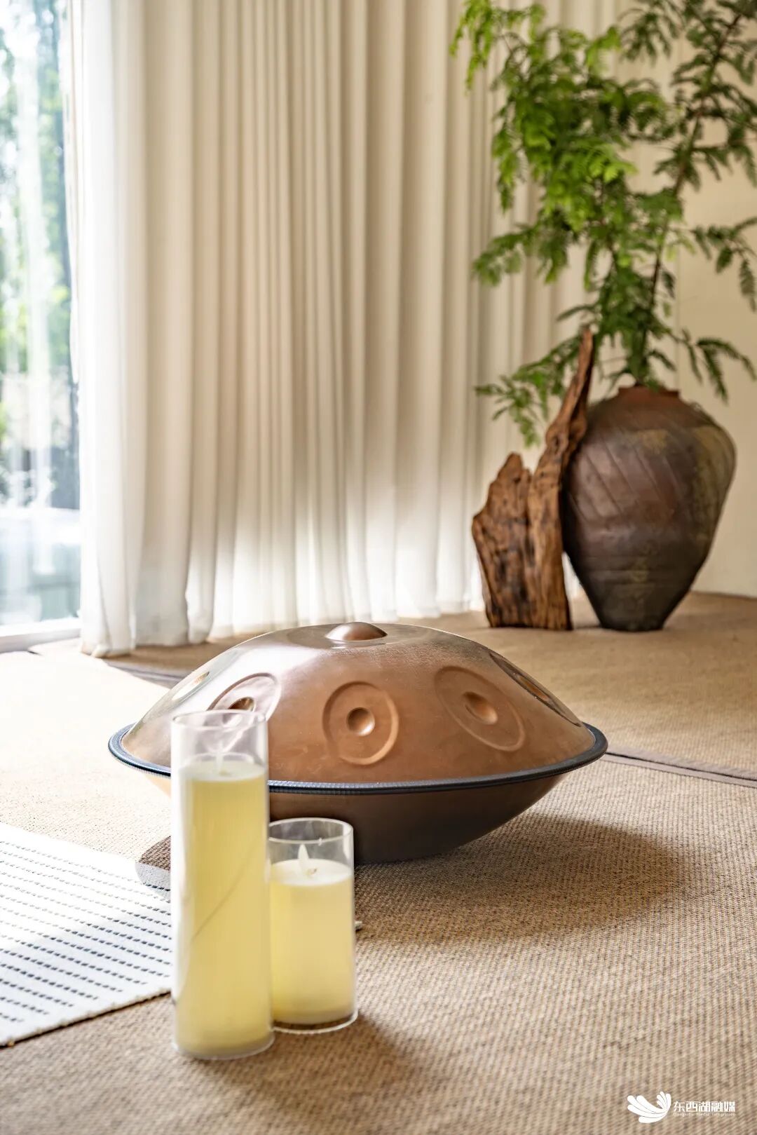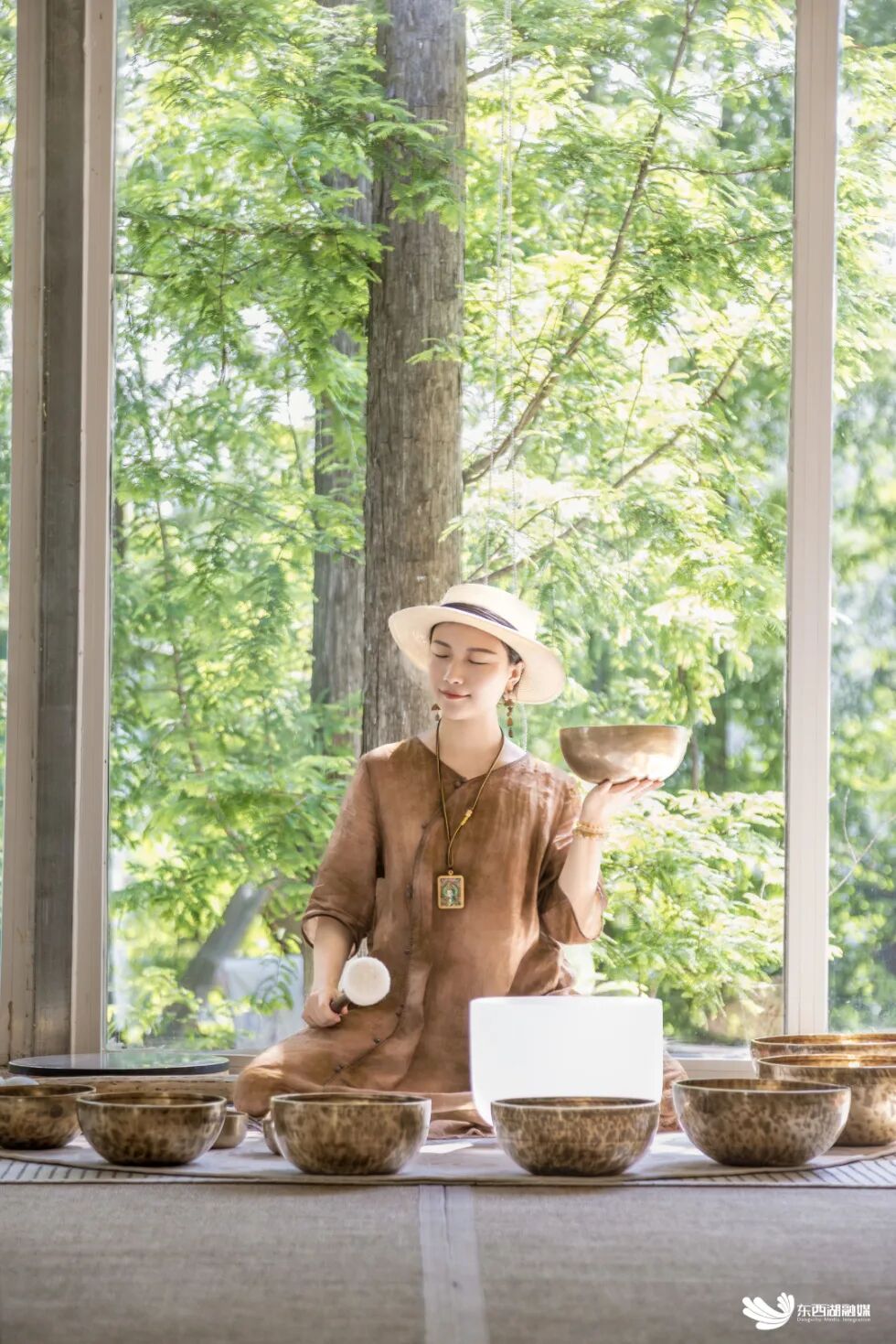 走进二楼的治愈教室,落地窗外的翠绿森林形成天然屏风,与地上铺设的草席共同构成独具魅力的中式美学意境,治愈师在席间轻敲颂钵,低沉悠远的共鸣声如云朵般轻柔包裹身心,带来深度的放松体验。