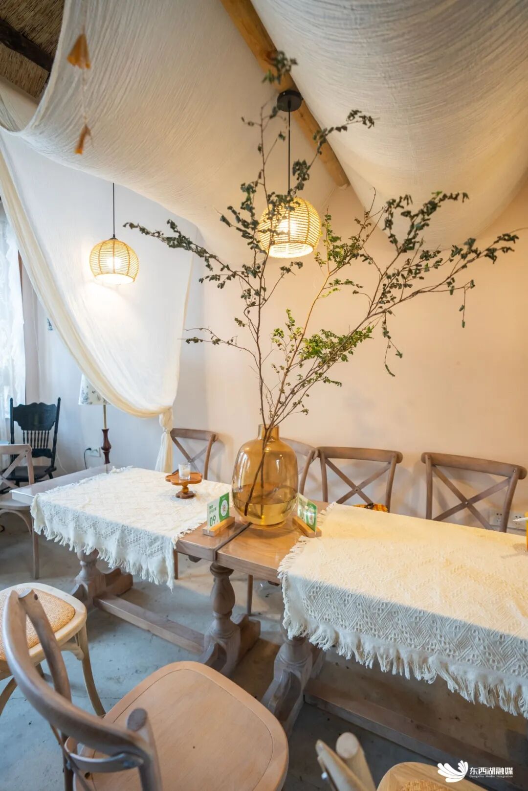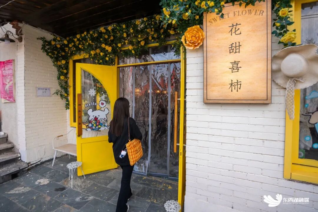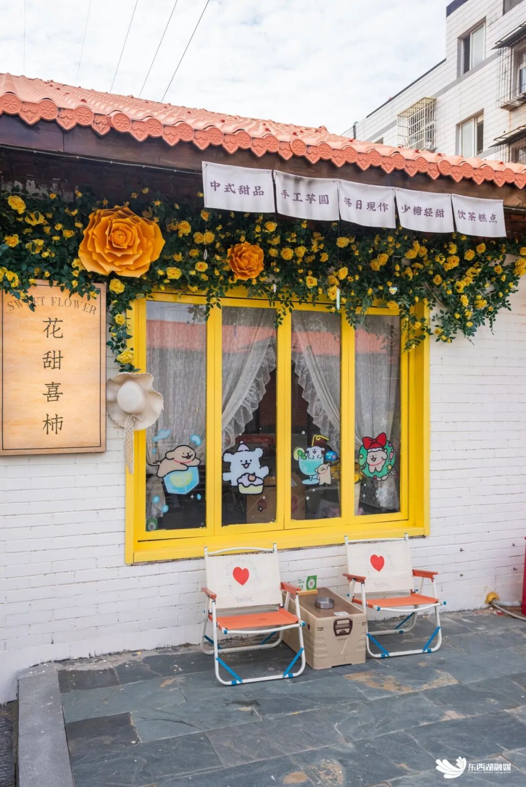 距蓝色水塔约百米处,“花甜喜柿”甜品店的碎花窗帘随风轻摆。白色鹅卵石铺就的小径旁,黄玫瑰簇拥着店铺招牌。推门而入,一架复古钢琴静立角落,碎花桌布上的烛光摇曳,仿佛瞬间穿越到普罗旺斯的乡间小屋。