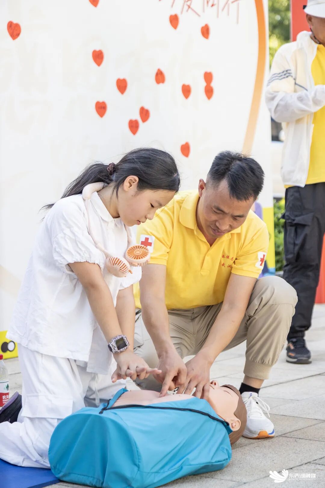 还有儿童跳蚤市场里童言童语,让人捧腹大笑。长江救援队等志愿团队也进驻,免费提供心肺复苏培训等公益服务。街道内吃喝玩乐各小店的体验展台排成长队,集赞兑换礼品环节让居民惊喜连连。