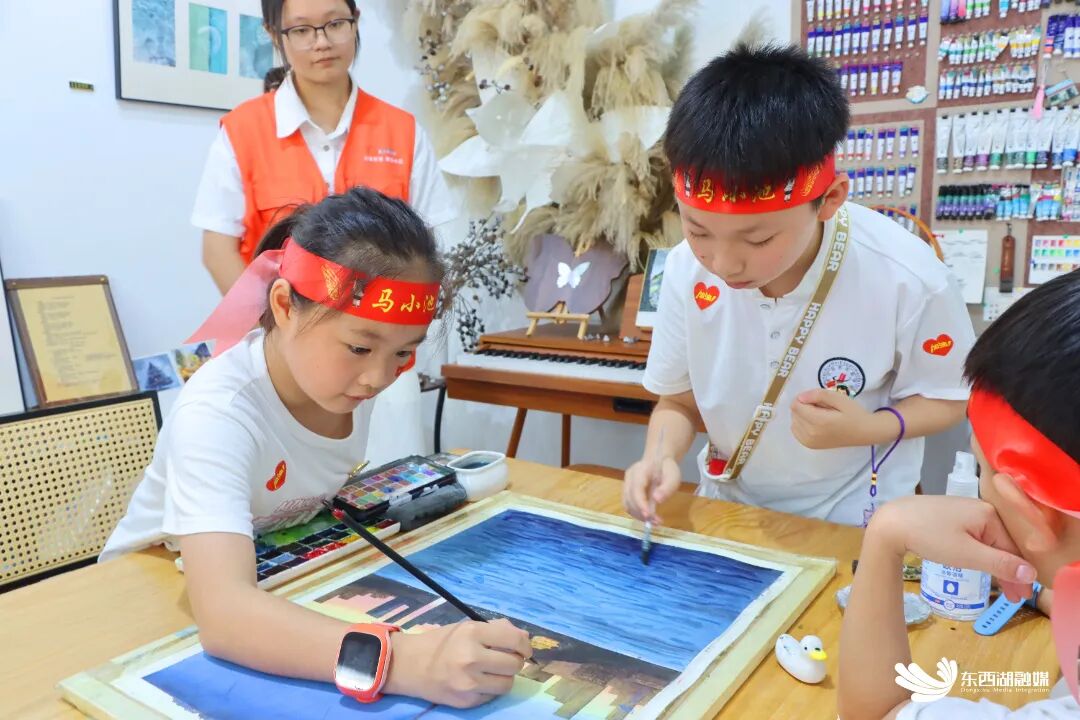 言寺艺术空间变身临时画室,店主指导孩子们挥洒水彩。