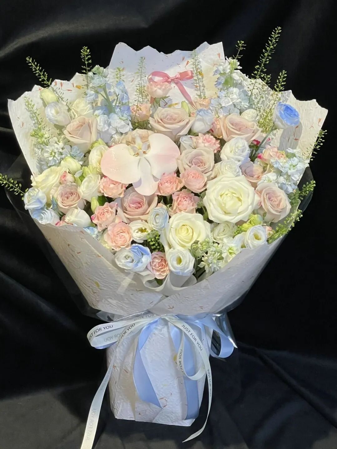李潇会根据不同需求和场景准备花束:毕业时的感谢花束,多用向日葵和尤加利,看着清爽又有朝气;情侣间的心意花束,偏爱用玫瑰搭小苍兰;恭贺时的祝福花束,就选大朵的百合和康乃馨,饱满又热闹。她甚至会根据客人送花时穿搭的色系来搭配花束,说这样送花时的画面特别和谐。“每当客人收到花,表示十分满意,我就觉得很幸福,我用心做的花,让每一份爱意都得到了美好的表达。”