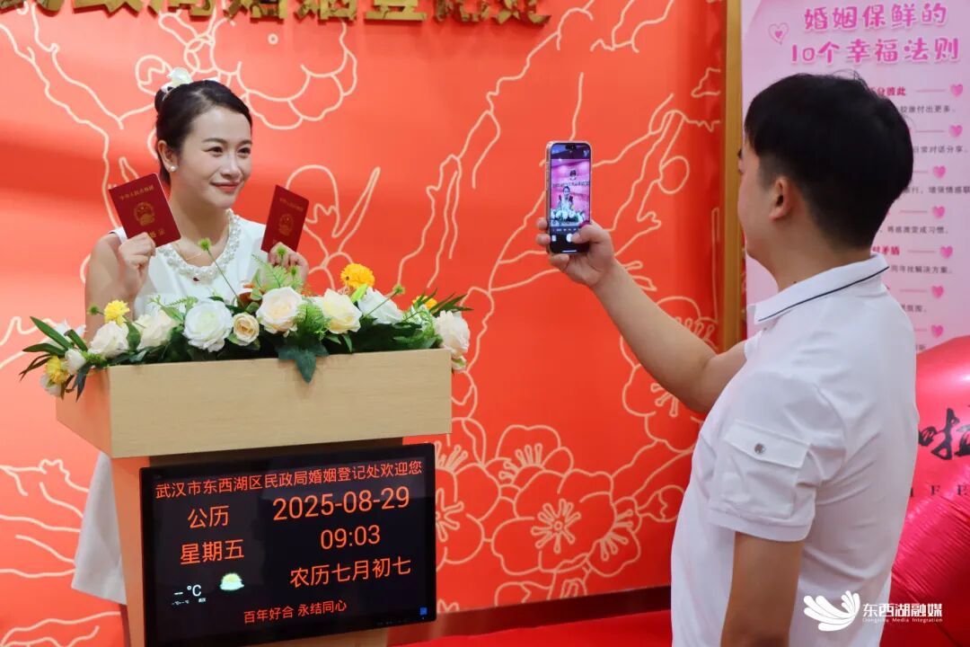 “七夕当天,网上预约结婚登记90对,截至12点已办理86对。”东西湖区婚姻登记处相关负责人表示,针对今日登记小高峰,已采取午间轮班、线上预约分流等措施,“每半小时控制在十对以内,现场也可取号,确保每对新人都能顺畅办结、参与体验。”