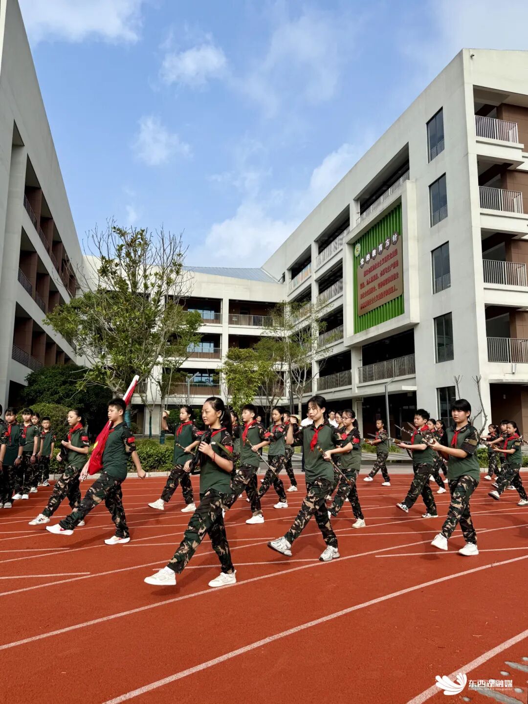 清脆的铃声响起,全校师生齐聚操场,举行庄严的升旗仪式。仪式融入国防教育元素,队列整齐、少先队员行队礼、国歌嘹亮。“请党放心,强国有我!”铿锵誓言回荡在校园上空。