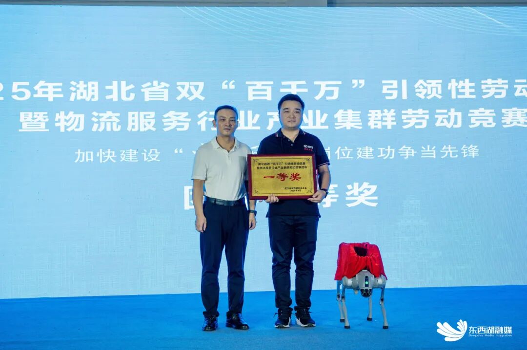 9月16日,2025年湖北省双“百千万”引领性劳动竞赛暨物流服务行业产业集群劳动竞赛决赛,在东西湖区闭幕。赛后颁奖仪式上,智能机器狗驮着奖牌证书,稳稳走向颁奖台,吸引了全场目光。