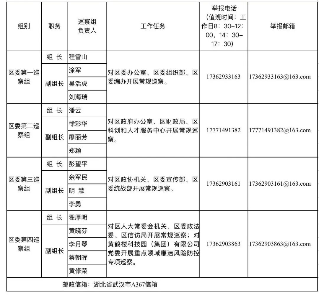 本轮巡察驻点时间60天左右,其间设立专门信访电话、电子邮箱、邮政信箱和“荆楚码上巡”信访反映二维码,主要受理反映被巡察党组织领导班子及其成员、下一级党组织主要负责人的来电来信和举报反映。