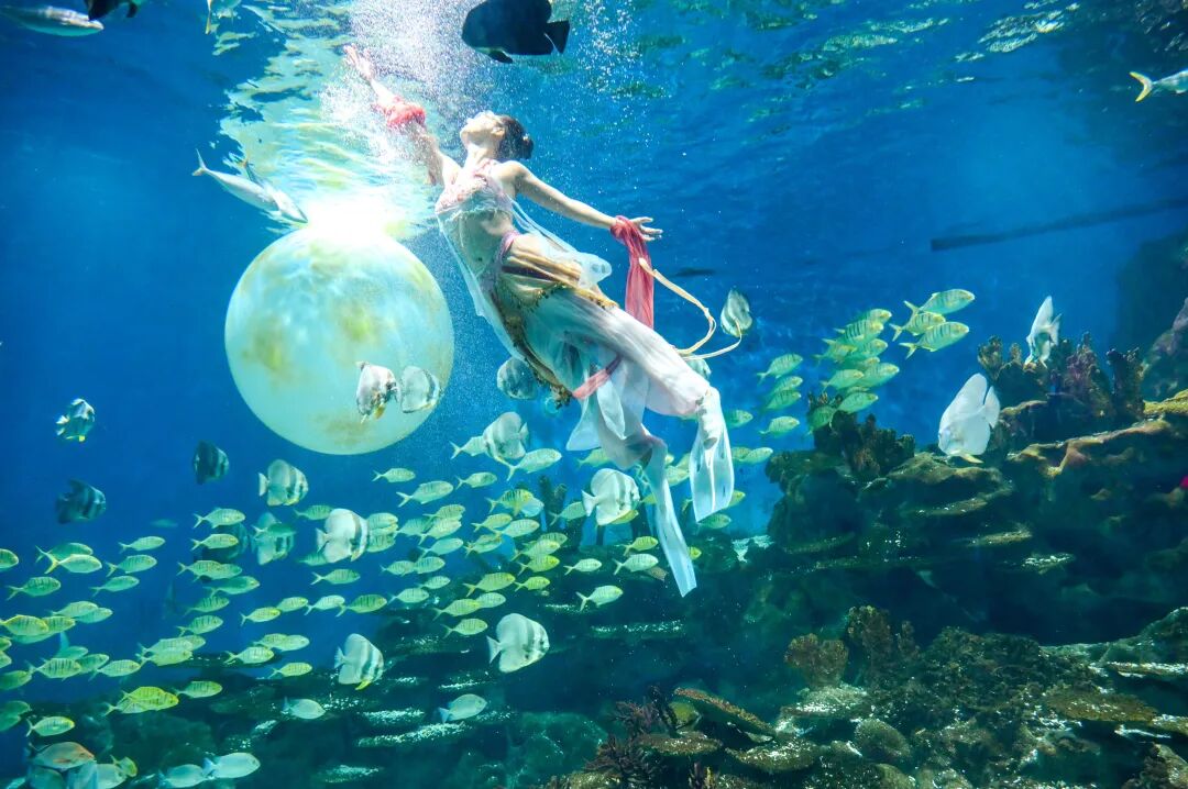 让人眼前一亮的,是水下的浪漫。“水下嫦娥奔月”中,潜水员化身嫦娥,在水中轻盈起舞,鳐鱼相伴,鱼群如星,画面如梦似幻。“水下吴刚舞剑”,则以刚柔并济的舞姿,为古老传说注入了新的生命力。