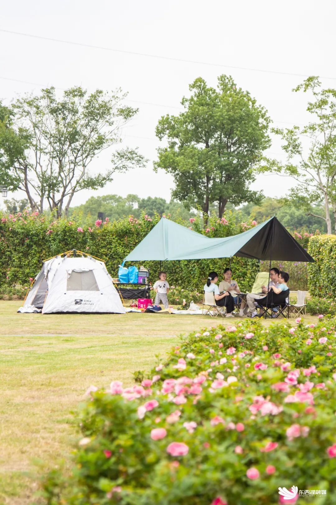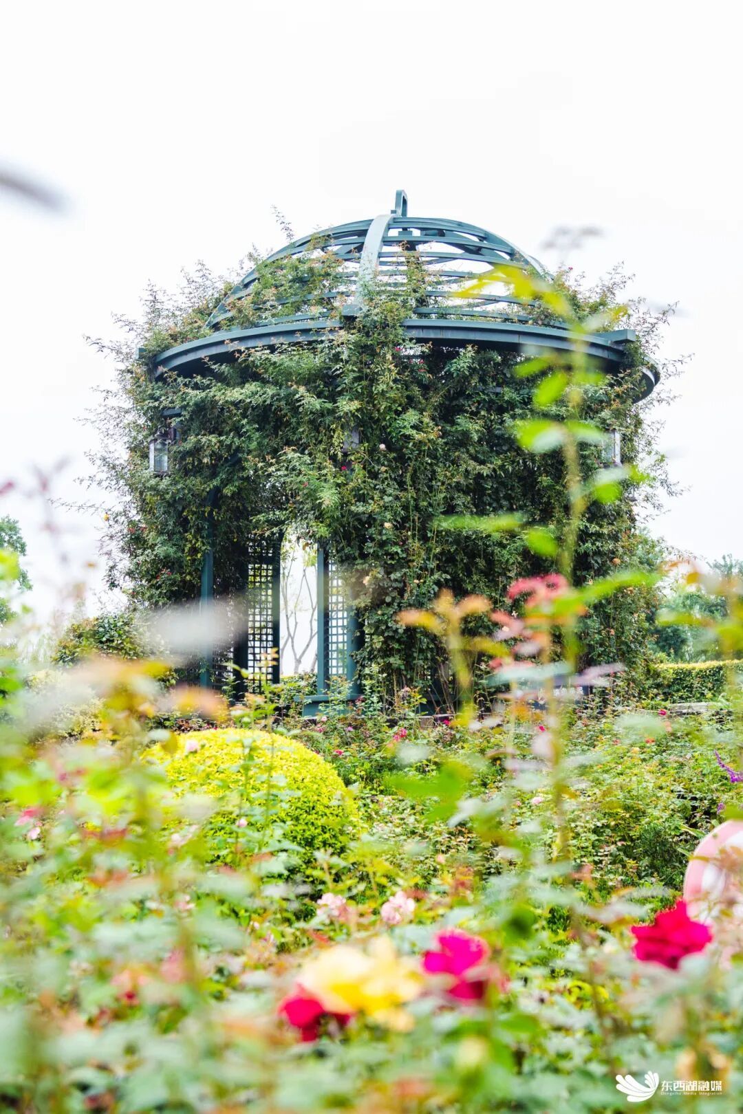 此时的花园像被打翻了调色盘,正红色的“卡罗拉”热烈似火,粉白渐变的“朱丽叶”温柔如诗,每处花境的颜色和植物种类造型,都搭配得相得益彰。这是今年月季花园经历夏季高温后,再次开花,虽然没有四月花开的茂盛,但也十分出片,几处花墙绿叶葱葱,挂满玫红色的花朵,让人流连驻足。花园里还有大片的草坪可供小朋友们尽情奔跑玩耍,湖边的绿地适合扎帐篷露营。