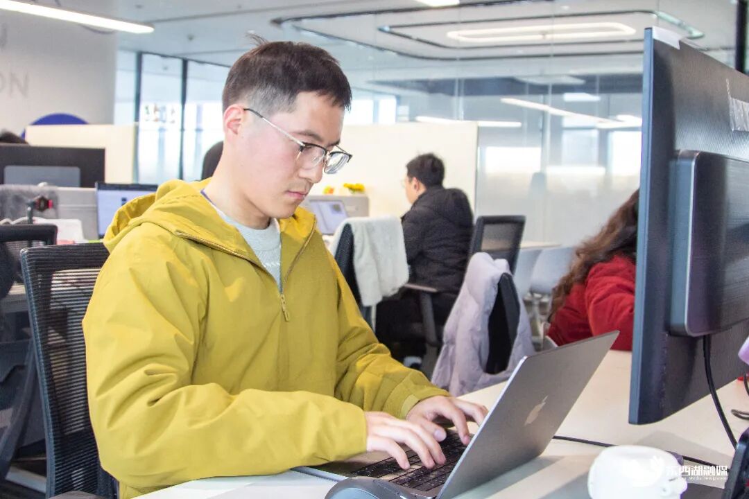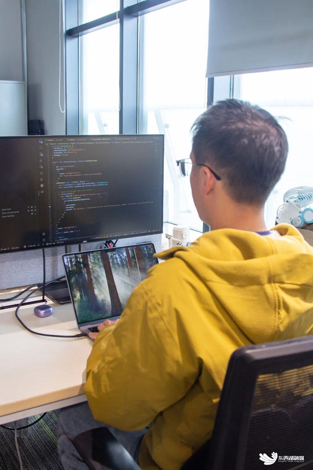 春日暖阳透过落地窗,洒在东西湖区迪马创聚场的一人工位上。28岁的喻光鑫端坐在电脑前,双手在键盘上飞舞,一行行代码在屏幕上快速跳动。这个不足两平方米的空间,是他全部的办公天地。这里没有同事,没有领导,只有他和他的代码。