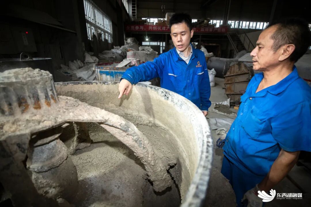 丁志恒(左)与技术人员讨论耐火材料配比。